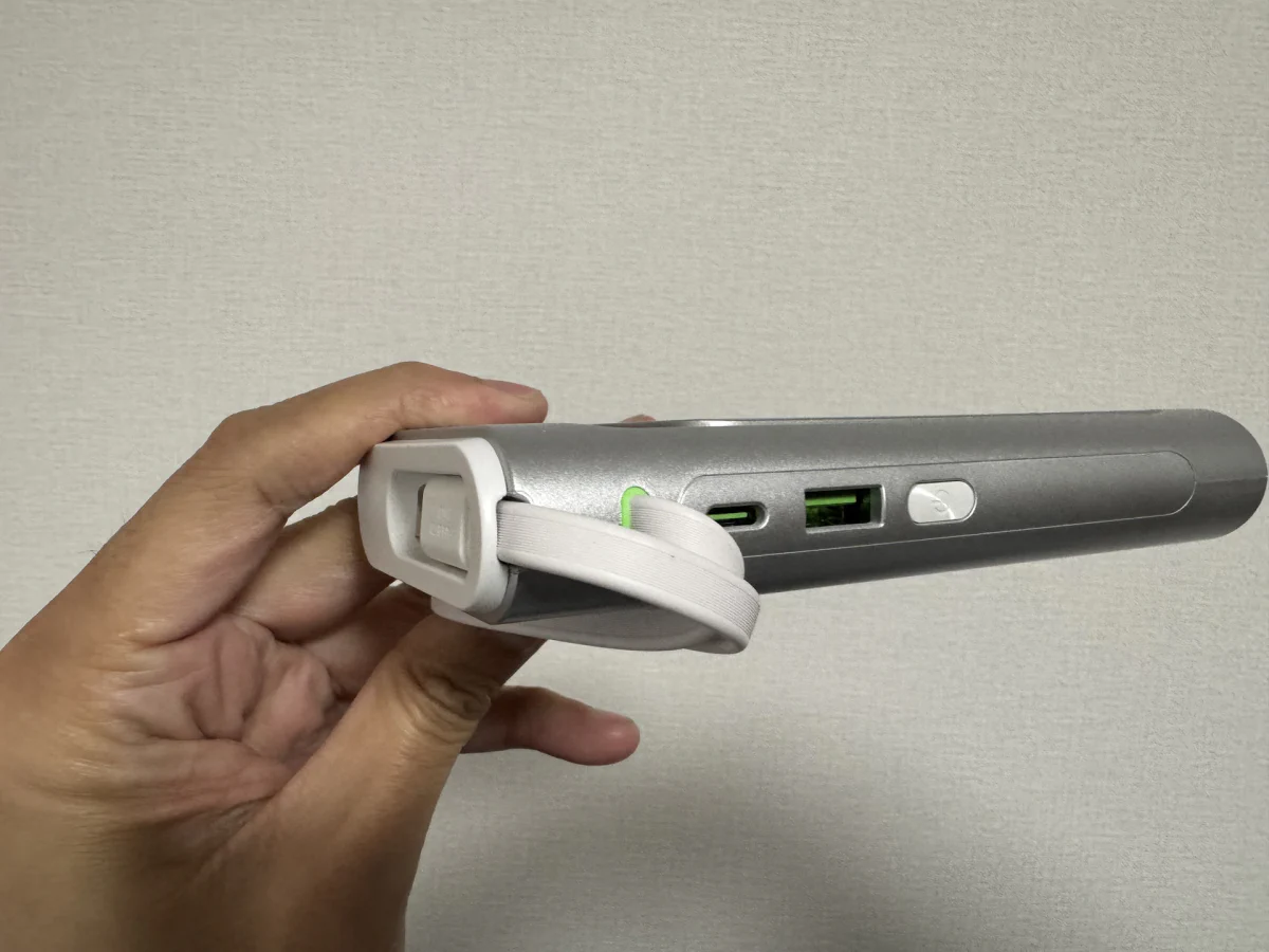 まずは普段利用しているiPhone15 Pro Maxに接続、サイズもPro Maxよりは小さいです。Type-Cのケーブル内臓なのでそのまま繋げることができます。