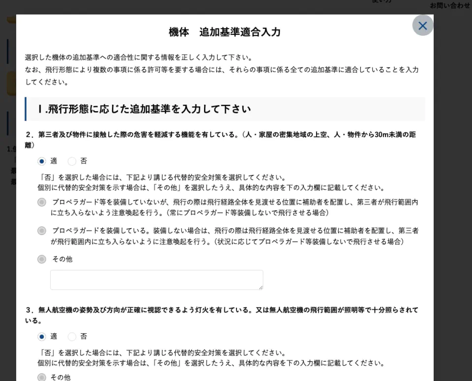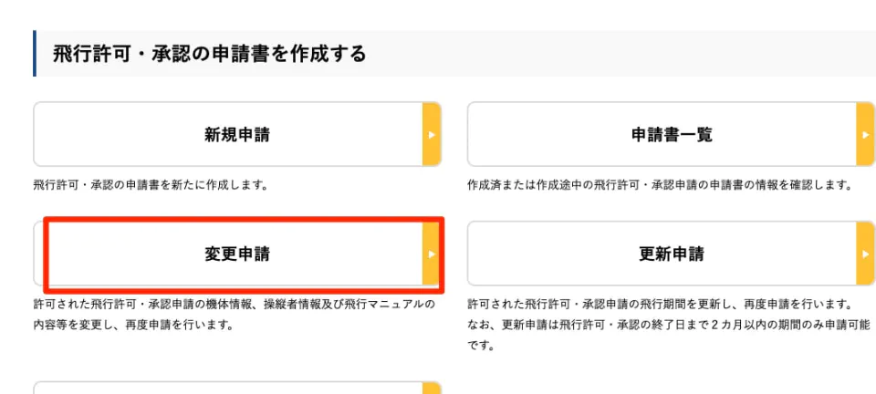 今回はDJIシリーズの申請の有効期限が12月まであり、条件が同じであること、また、通報システムで指定する際に1つの申請にまとまっていないと別々に通報する必要があるという注意点があるため、現在有効な申請の変更申請で機体を追加することにしました。