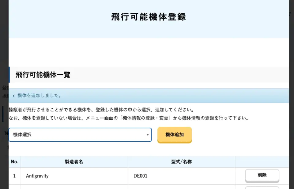 操縦者情報に関しては、機体情報が古いままなので、操縦者一覧で一度削除してから、再度追加する必要があります。(ここは分かりにくいのでDIPSの方で改善してほしい点です)