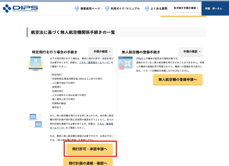 まず、DIPSのトップページから「飛行許可・承認申請」のページへ移動します。