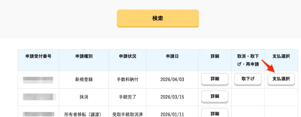 支払いに関するメールが届くので、DIPSの管理画面から「申請状況確認/取下げ/支払い」の項目へ移動し、該当申請の「支払選択」ボタンを押します。