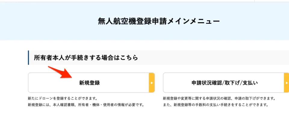 航空法に基づく無人航空機関係手続きの一覧に、「無人航空機の登録手続き」があるので、「無人航空機の登録申請へ」のボタンを押します。