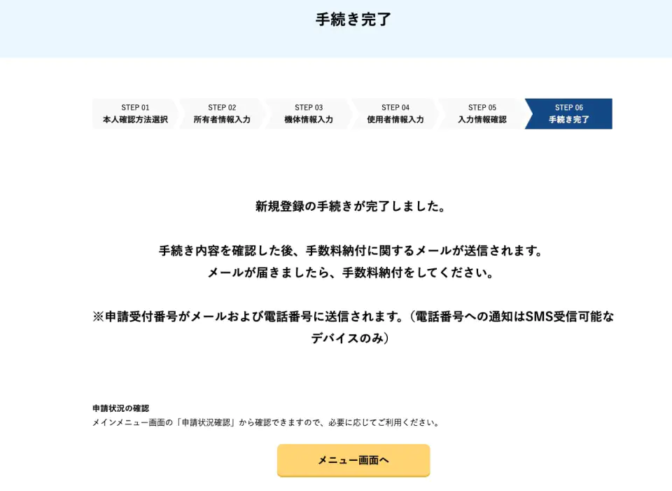 審査・手続き中となりますが、数分で審査が完了し、メールが届きますので、「機体情報・使用者情報の確認/変更」へ移動すれば、登録記号を確認することができます。