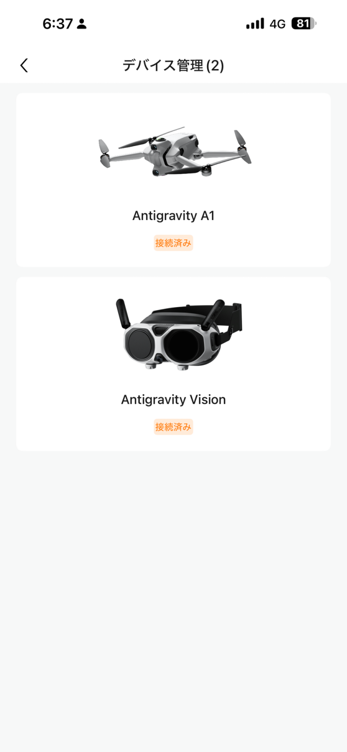 「デバイスの管理」を押すと、デバイス一覧が表示されるので、Antigravity A1を選択します。