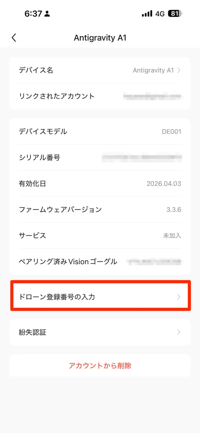 登録記号を機体に貼り付けるだけで終わりではありません。Antigravityアプリを利用して、機体と接続した状態でリモートIDの書き込みが必要です。