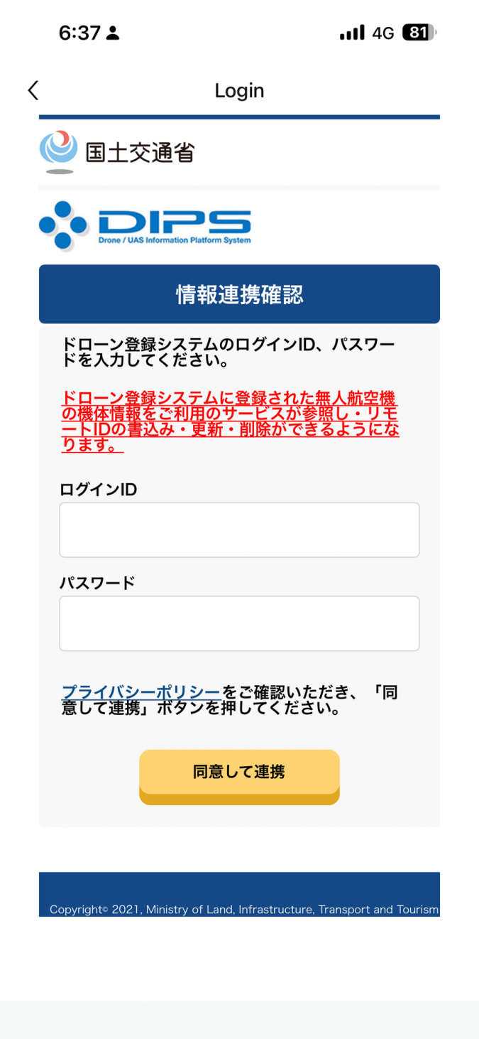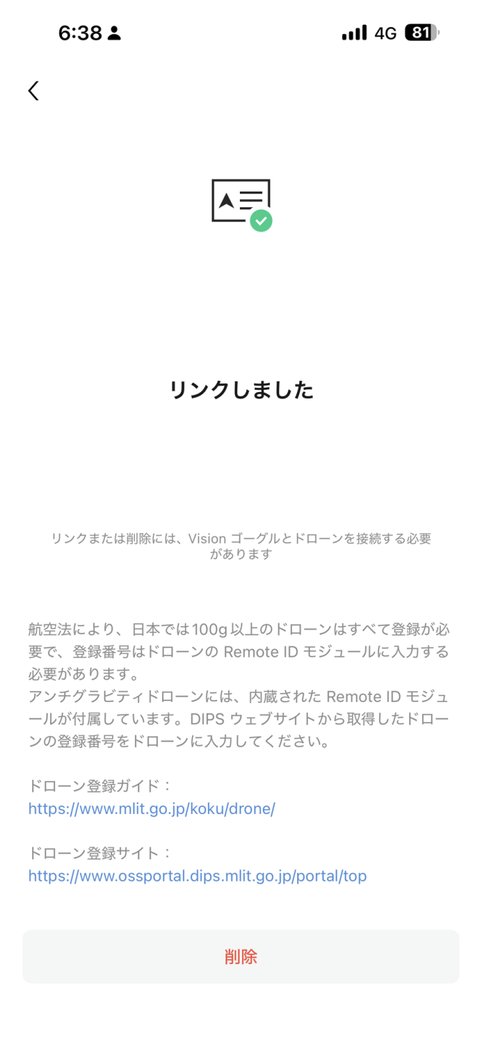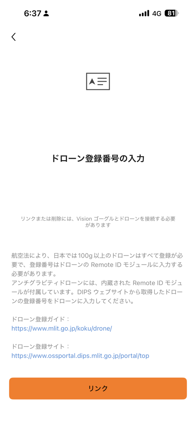 ドローン登録番号の入力画面が表示されるので、「リンク」ボタンを押します。