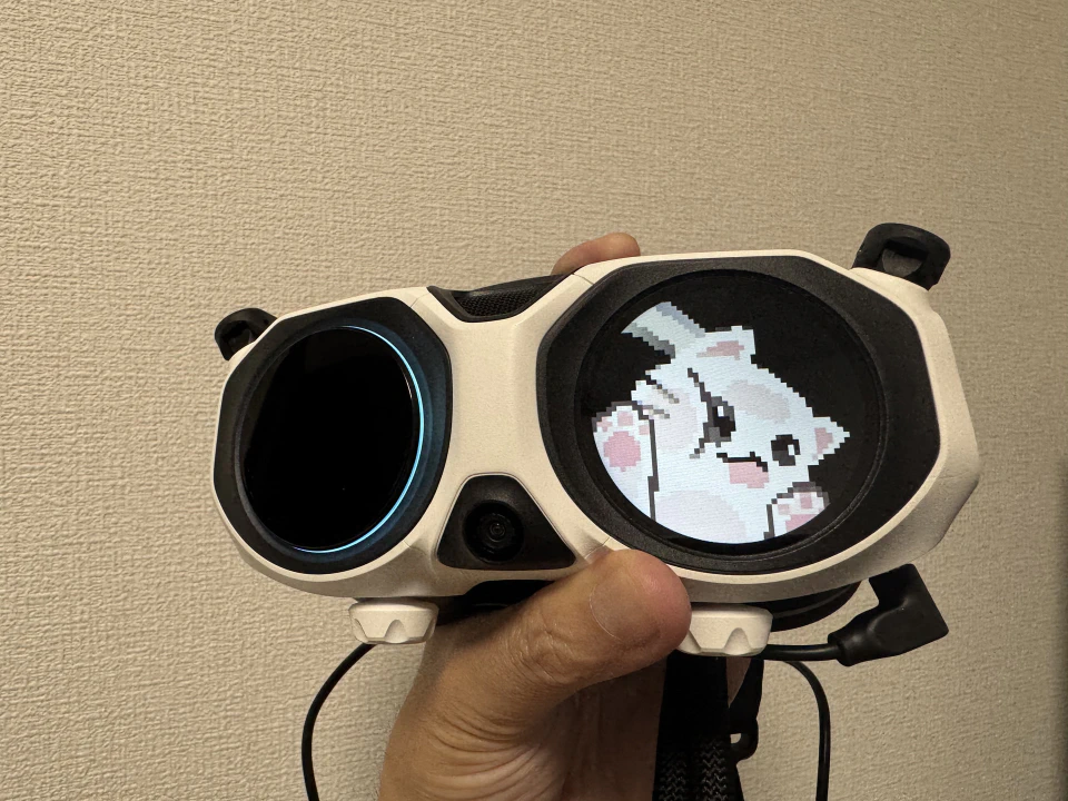 ゴーグルの左目の外側はディスプレイになっているため、アニメーションを表示したり、実際に飛行中は、ゴーグルを装着している人が見ている景色を表示することで、外にいる人にもどのような映像が見えているかを伝えることも可能です。このような細かな配慮も、体験を共有する上で非常に効果的だと感じました。